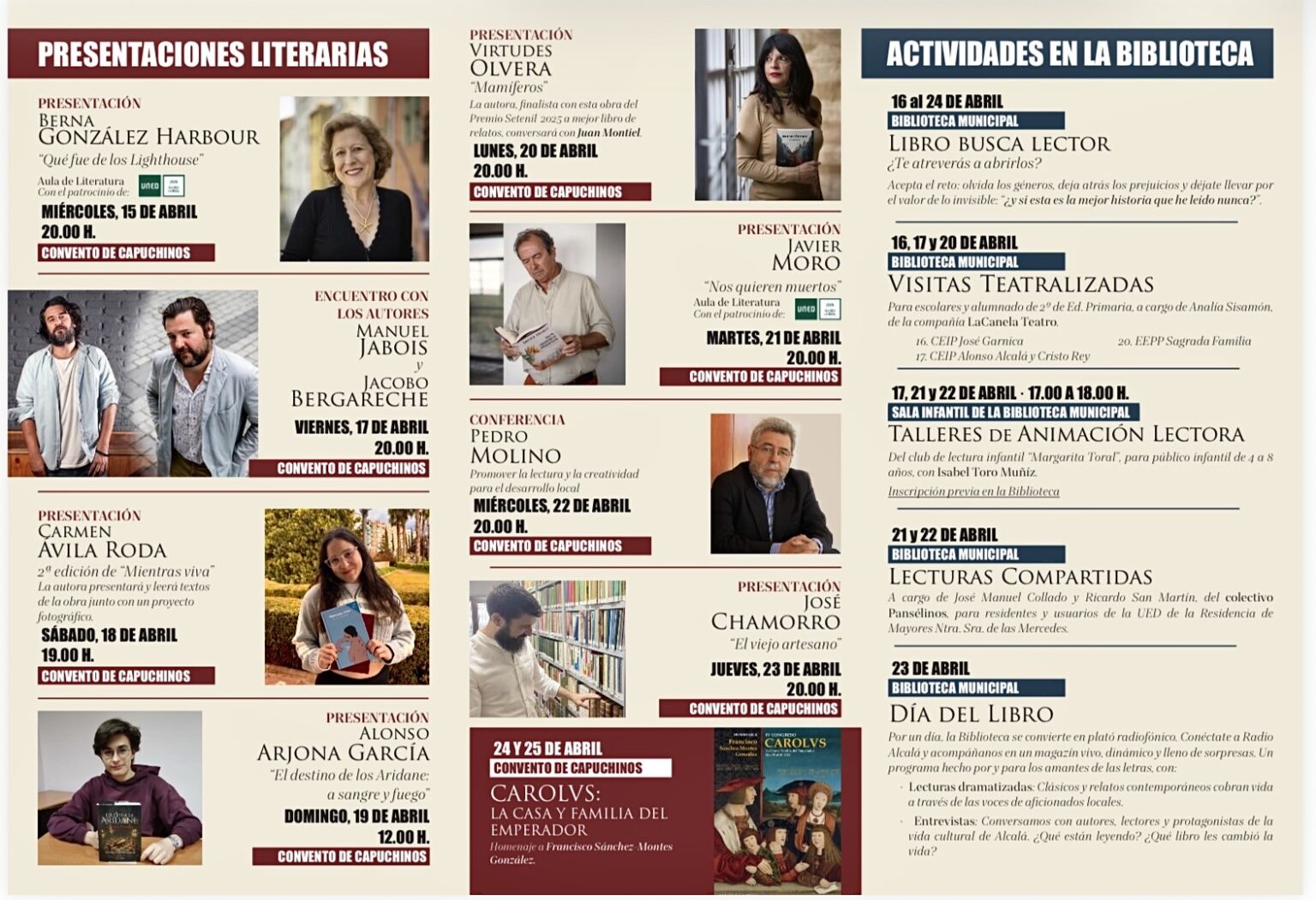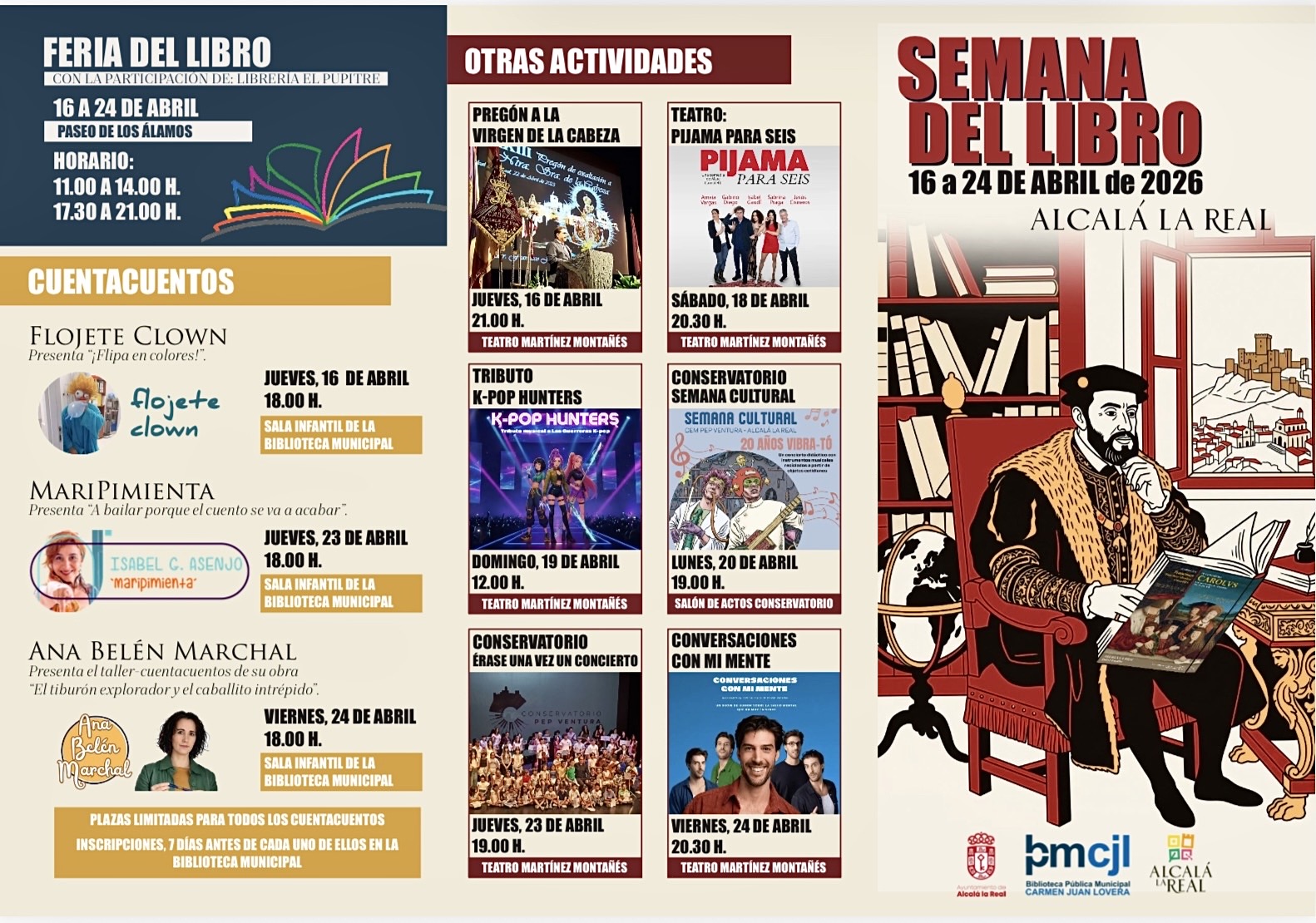 La programación infantil incluye visitas teatralizadas y sesiones de cuentacuentos, además de iniciativas innovadoras como el reto “Libro busca lector” o el magazine radiofónico “El balcón de Alcalá”, de Radio Alcalá, que se emitirá en directo desde la biblioteca con motivo del Día del Libro.